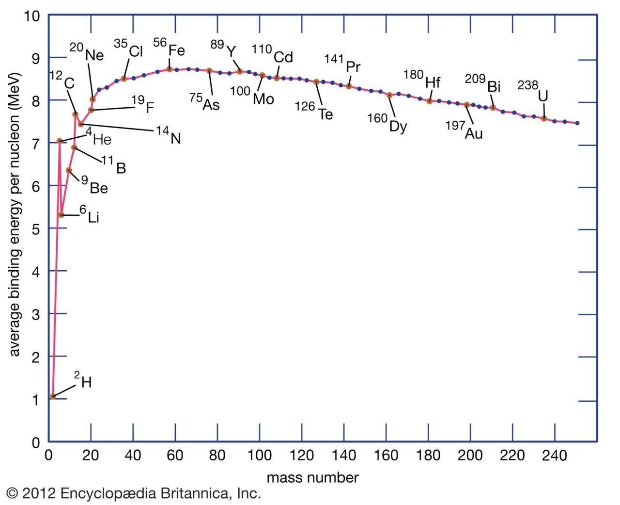 Esses efeitos opostos de atração (força nuclear forte) e de repulsão (força de Coulomb) se equilibram em torno da região do ferro e do níquel. É ali que se encontra o valor máximo de energia de ligação por núcleon.